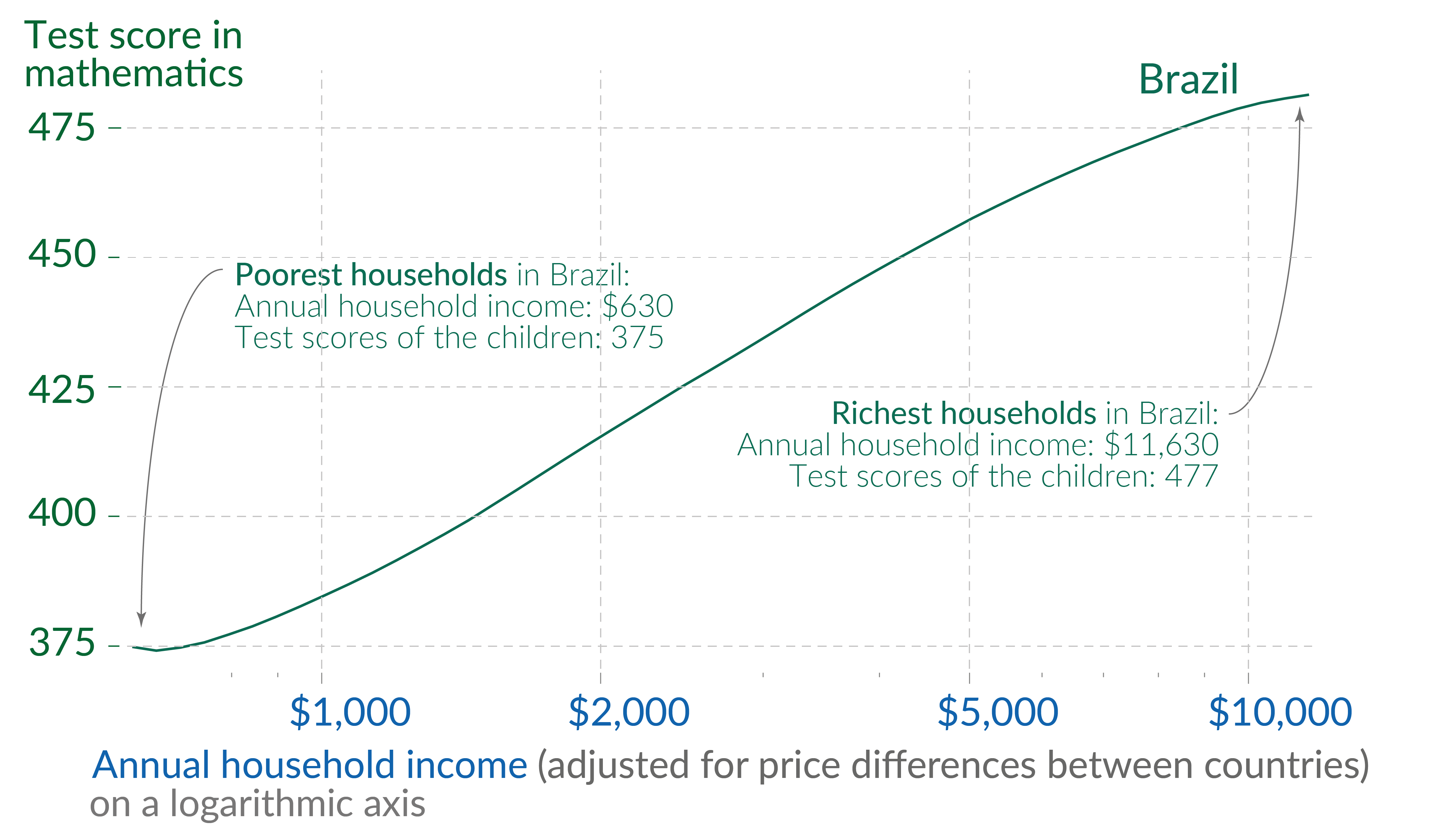 The sloping line in the small chart below shows the distribution of test scores in Brazil. It plots the students' mathematics scores on the vertical axis against their family’s incomes on the horizontal axis.