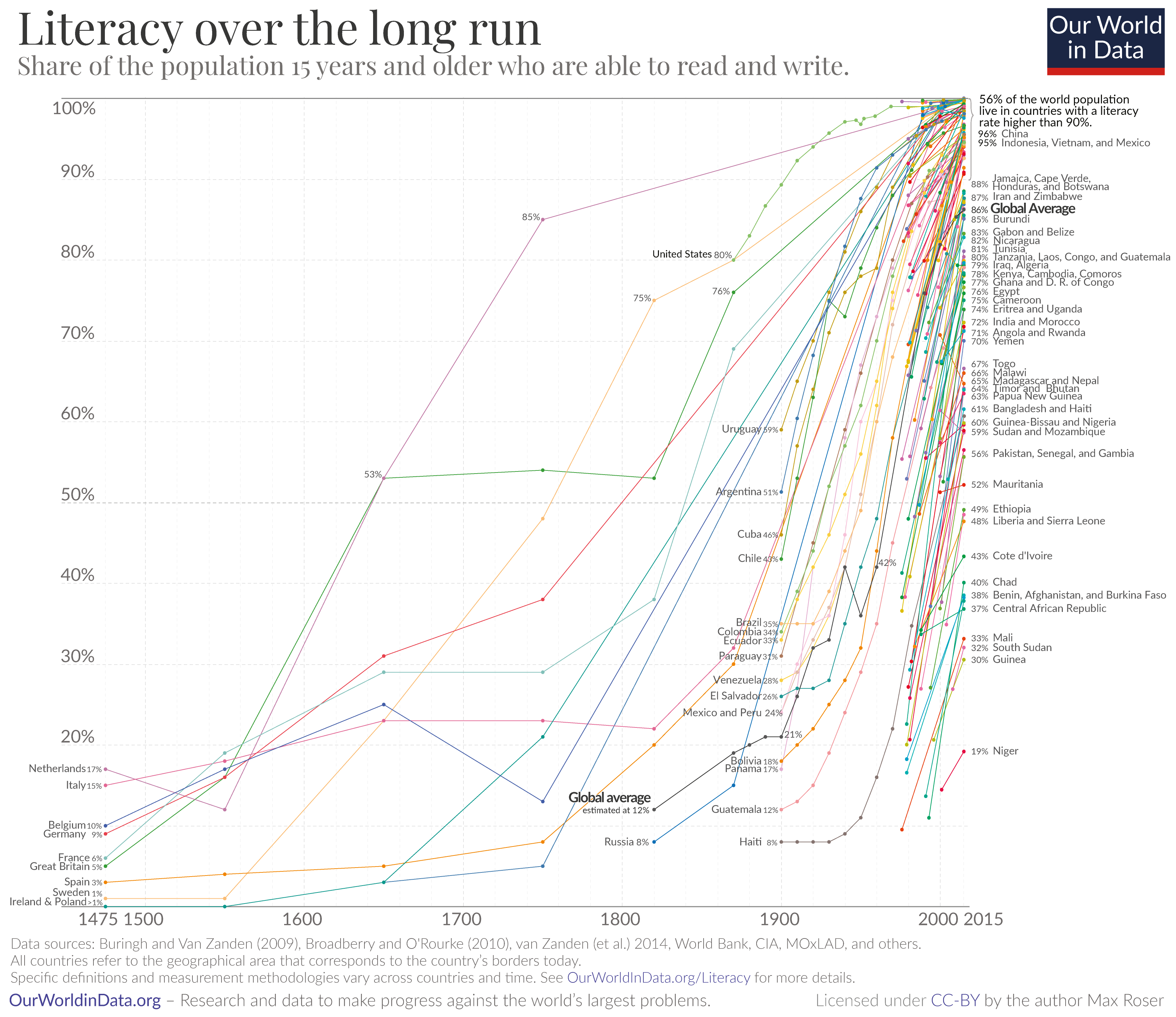 Even basic skills – such as reading and writing – were only attainable for a small elite. This chart brings together estimates of basic literacy from around the world to show how this has changed.11