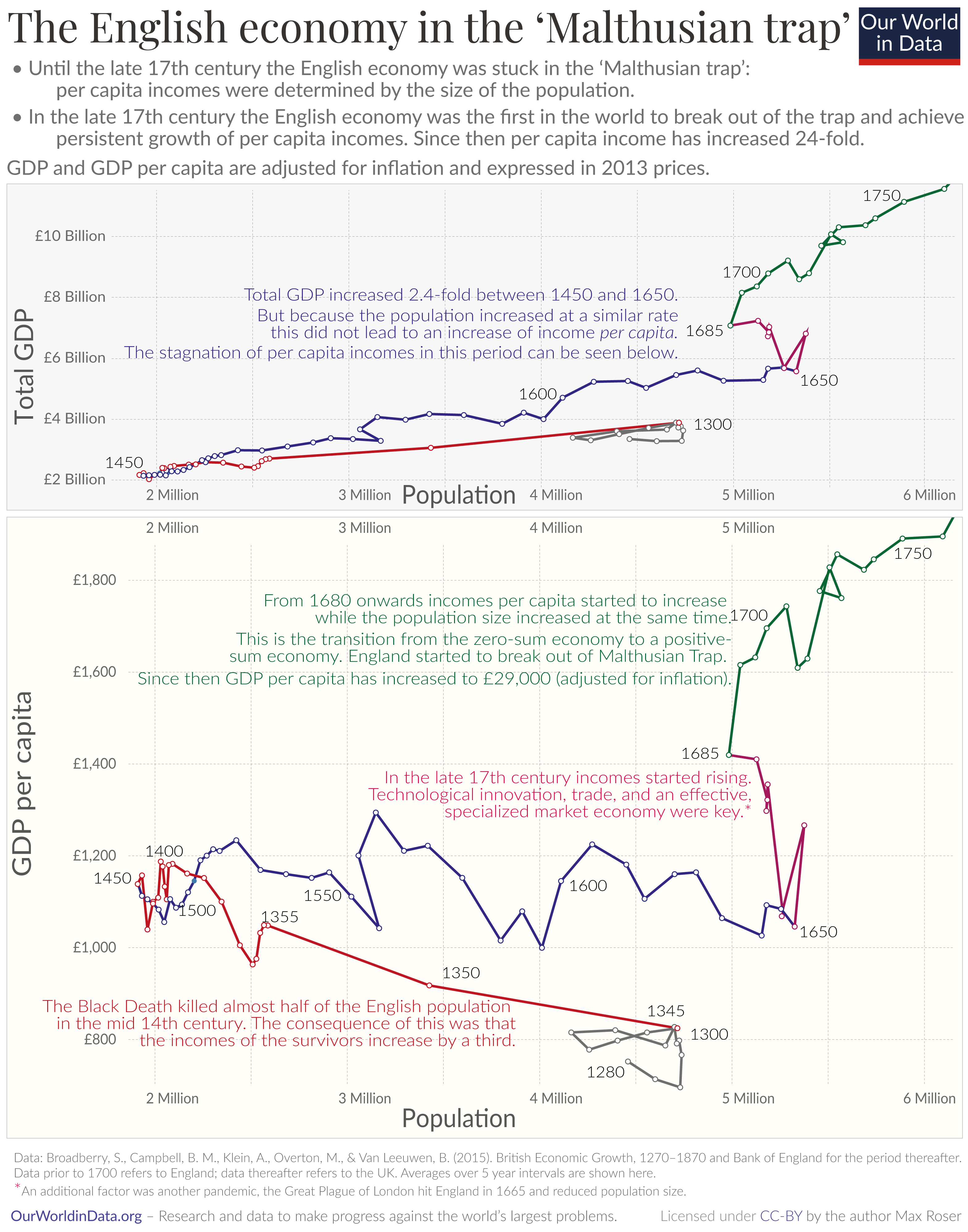 Max Roser (2020) - “Breaking out of the Malthusian trap: How pandemics allow us to understand why our ancestors were stuck in poverty” Published online at OurWorldInData.org. Retrieved from: 'https://ourworldindata.org/breaking-the-malthusian-trap' [Online Resource]BibTeX citation