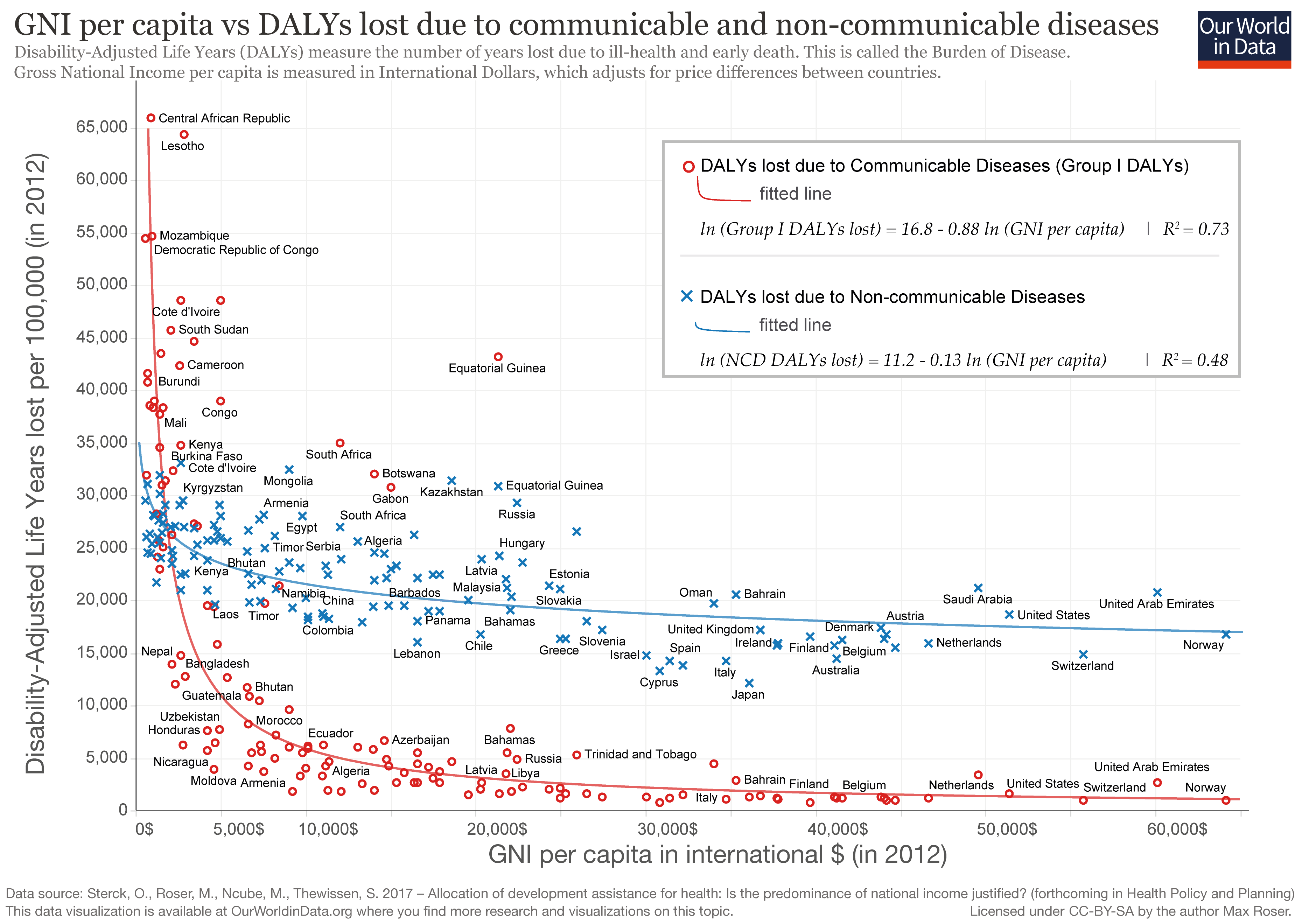 The correlation between both measures is apparent: both DALY loss rates and the total share from communicable diseases tend to decline with increasing incomes. But despite this correlation, Sterck et al. 20171 find that GNI is not a significant predictor of health outcomes once other factors are controlled for.
