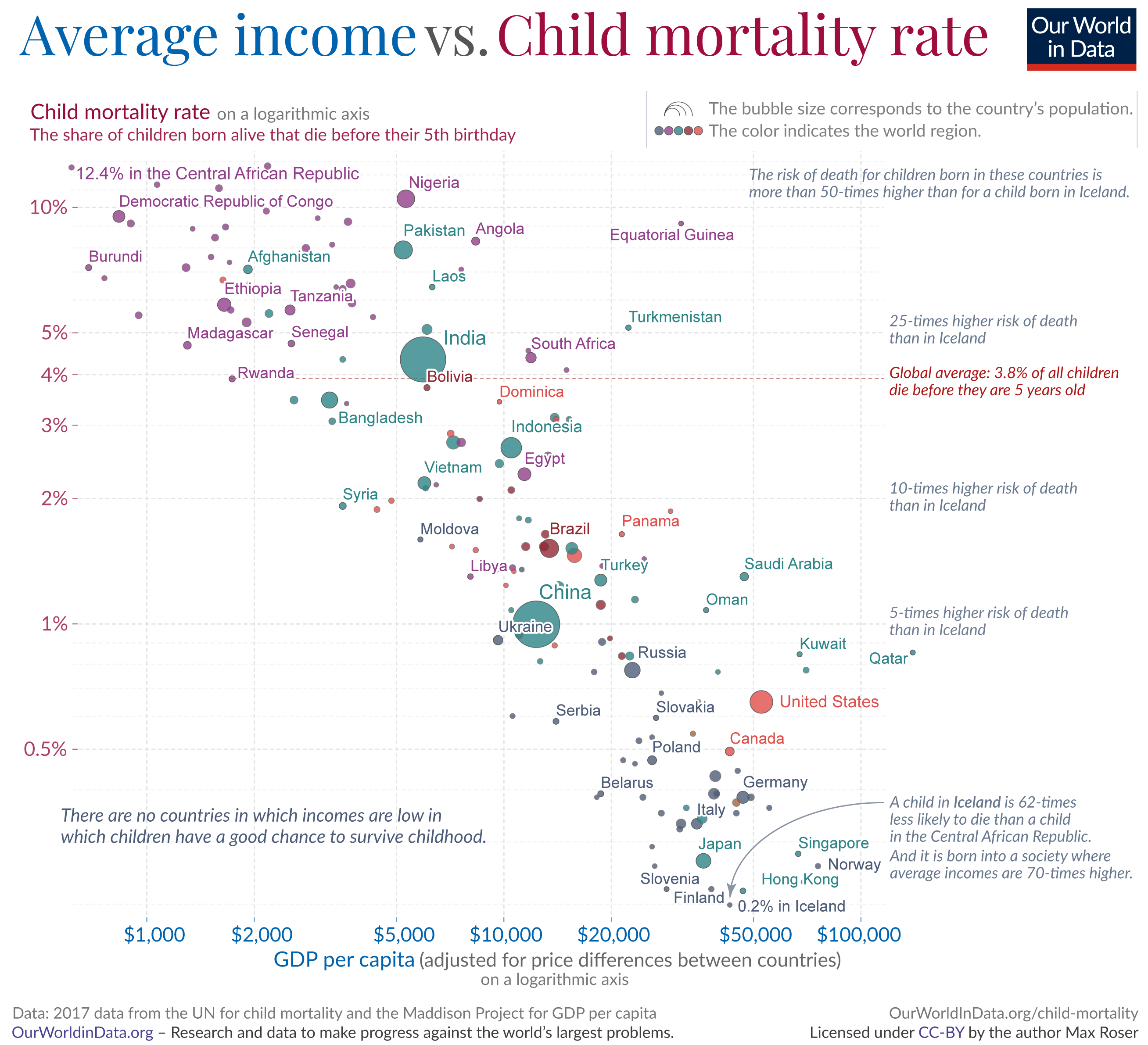 The fact that economic inequality maps on to the inequality of child survival means that a child in a rich country has an advantage in both ways: she can expect to survive and will live in a society where incomes are more than 70-times higher than in the poorest countries.