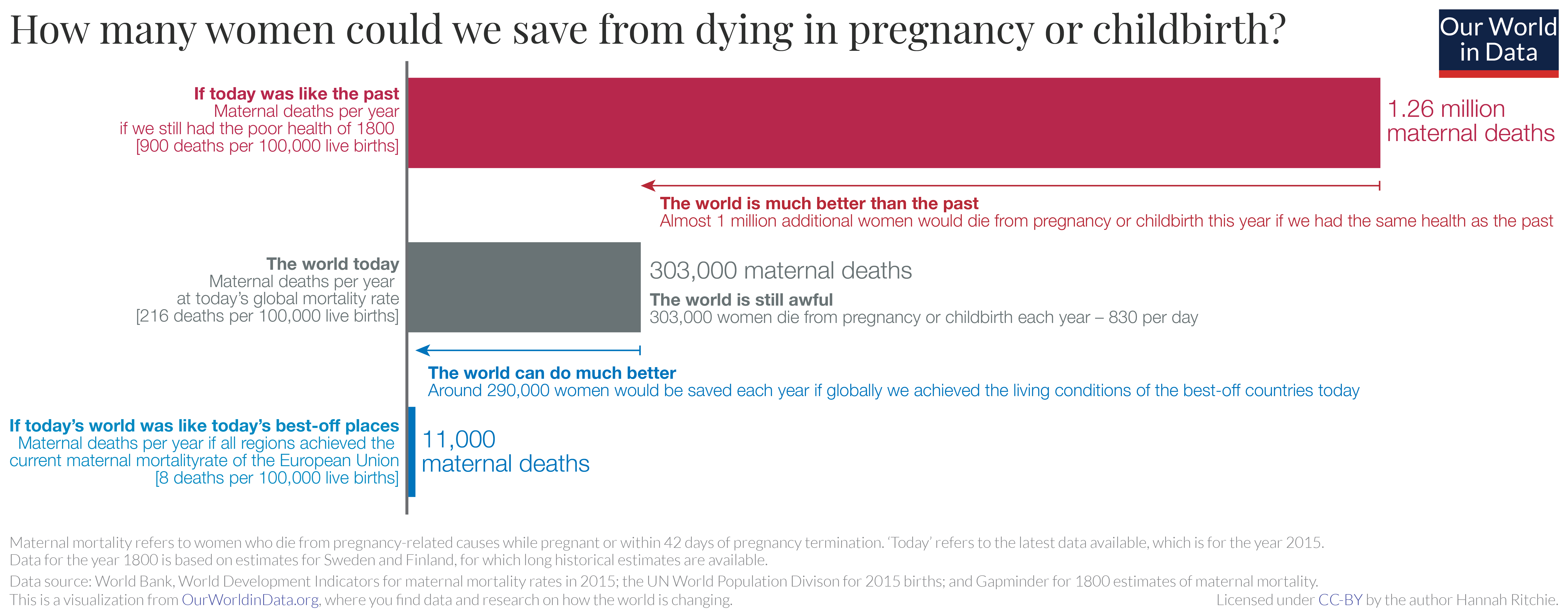 - If all regions had the health of the best-off countries: In 2015, the world region with the lowest maternal mortality was the European Union, where 8 women died per 100,000 live births. In the world of 2015, where 140 million women give birth each year, if all countries had this level of maternal mortality, far fewer — 11,000 — would die.3