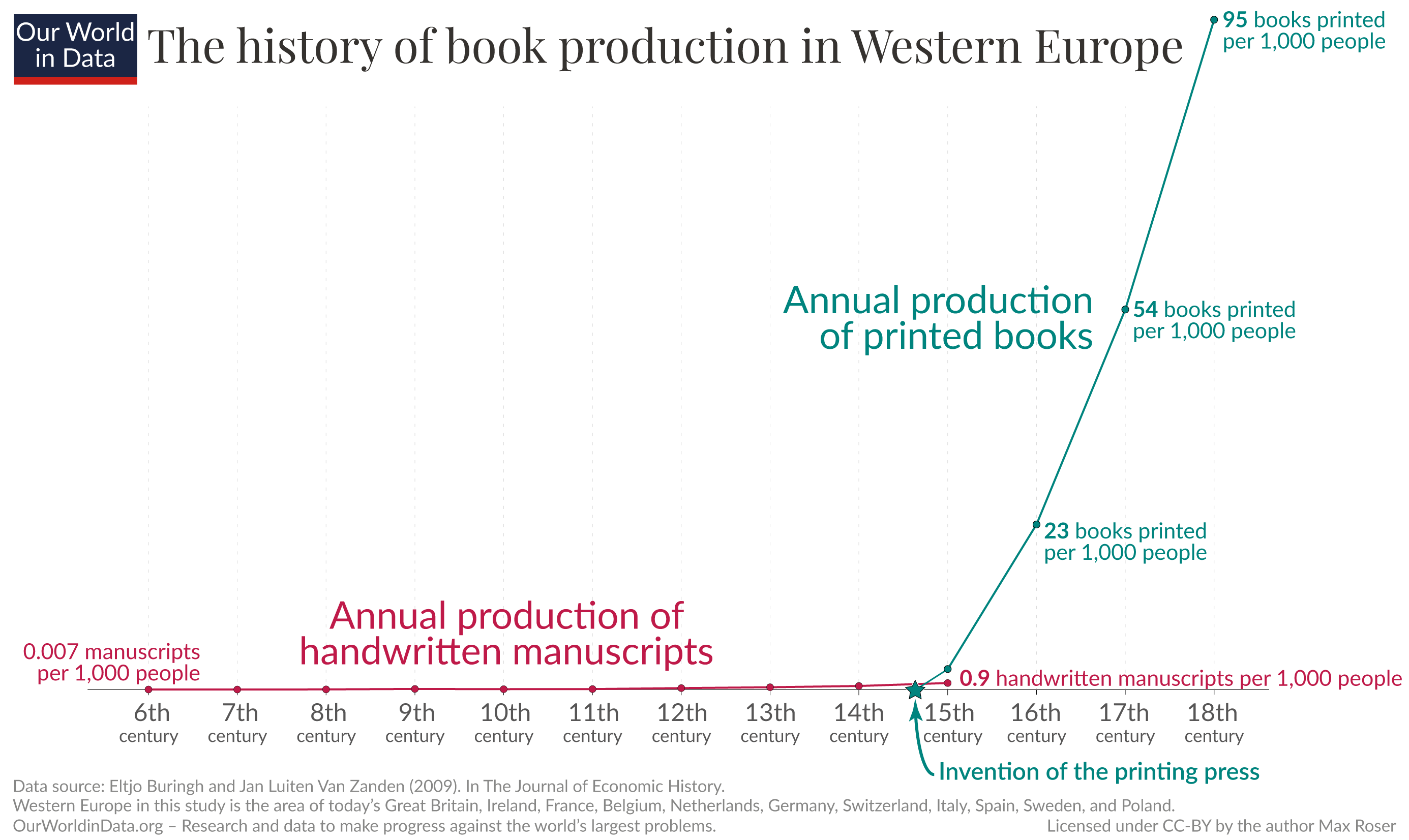 It is no accident that the shape of this chart is very similar to the chart on book production at the beginning of this text – very low and almost flat for many generations and then quickly rising. Both of these developments are driven by changes in production.